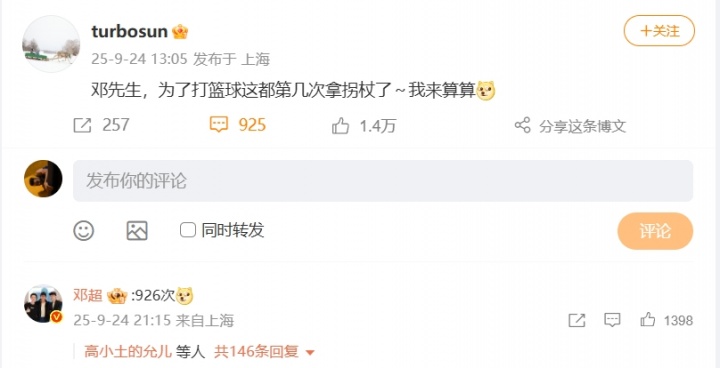 09月25日讯 邓超是演艺圈著名的篮球发烧友,此前还曾参加了姚明的姚基金篮球慈善赛。 链接>>>太可爱了!姚基金慈善赛姚明上场时拍了下邓超的小脑袋 相当开心 惨遭大帽后愣在原地!邓超逐帧分析视频@库兹马:这是干扰球吧? 昨日,邓超老婆、演员孙俪发布社媒:“邓先生,为了打篮球这都第几次拿拐杖了~我来算算” 邓超也现身评论区:“926次”