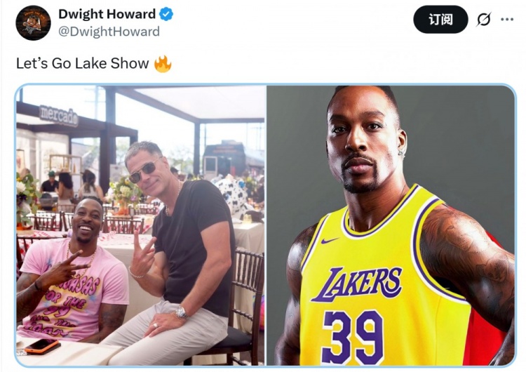 10月21日讯 NBA常规赛揭幕战即将打响,湖人将对阵勇士。 前湖人球员霍华德更新推特,他晒出了自己与佩林卡的合照,和自己身穿湖人39号的P图,写道:“湖人,加油!” |