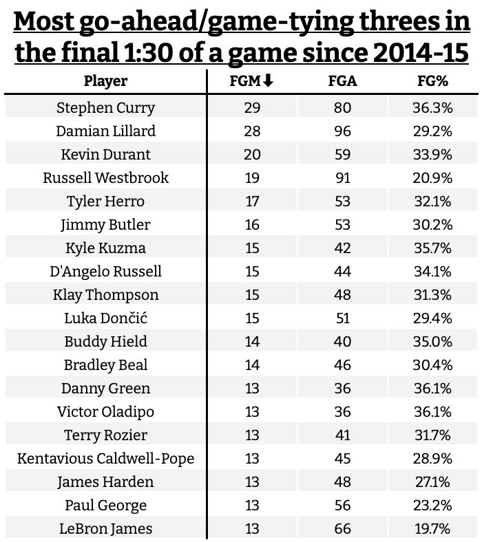 10月24日讯 NBA常规赛,掘金在客场以131-137不敌勇士。 常规时间最后时刻,库里在剩余21秒时轰进一记将比赛拖入加时的超超远三分。 数据网站统计,自2014-15赛季以来,最后1分30秒的追平&反超三分,库里已经轰进第29记,超越利拉德,独占第一。 具体榜单如下: 1、库里 80投29中 命中率36.3% 2、利拉德 96投28中 命中率29.2% 3、杜兰特 59投20中 命中率33.9% 4、威少 91投19中 命中率20.9% 5、希罗 53投17中 命中率32.1% 6、巴特勒 53投16中 命中率30.2% 7、库兹马 42投15中 命中率35.7% 8、拉塞尔 44投15中 命中率34.1% 9、克莱 48投15中 命中率31.3% 10、东契奇 51投15中 命中率29.4% 11、希尔德 40投14中 命中率35% 12、比尔 46投14中 命中率30.4% 13、丹尼-格林 36投13中 命中率36.1% 14、奥拉迪波 36投13中 命中率36.1% 15、罗齐尔 41投13中 命中率31.7% 16、波普 45投13中 命中率28.9% 17、哈登 48投13中 命中率27.1% 18、乔治 56投13中 命中率23.2% 19、詹姆斯 66投13中 命中率19.7%