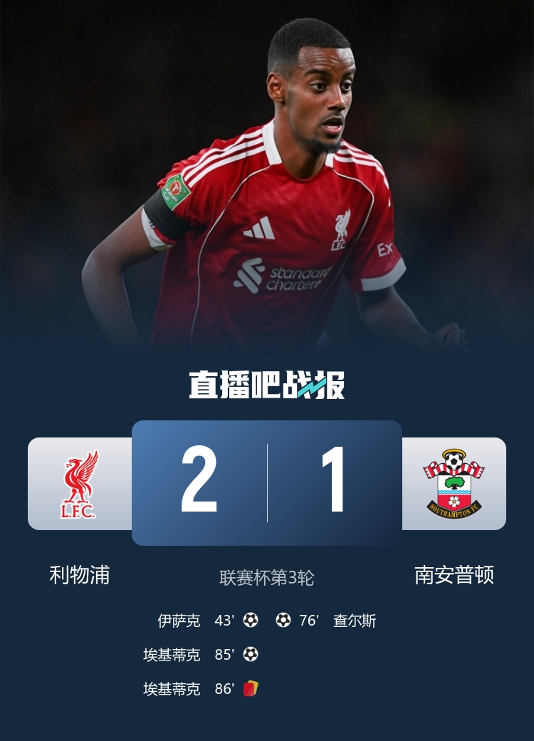【战报新闻】 又绝杀!利物浦联赛杯2-1圣徒晋级 伊萨克首球埃基蒂克绝杀+染红