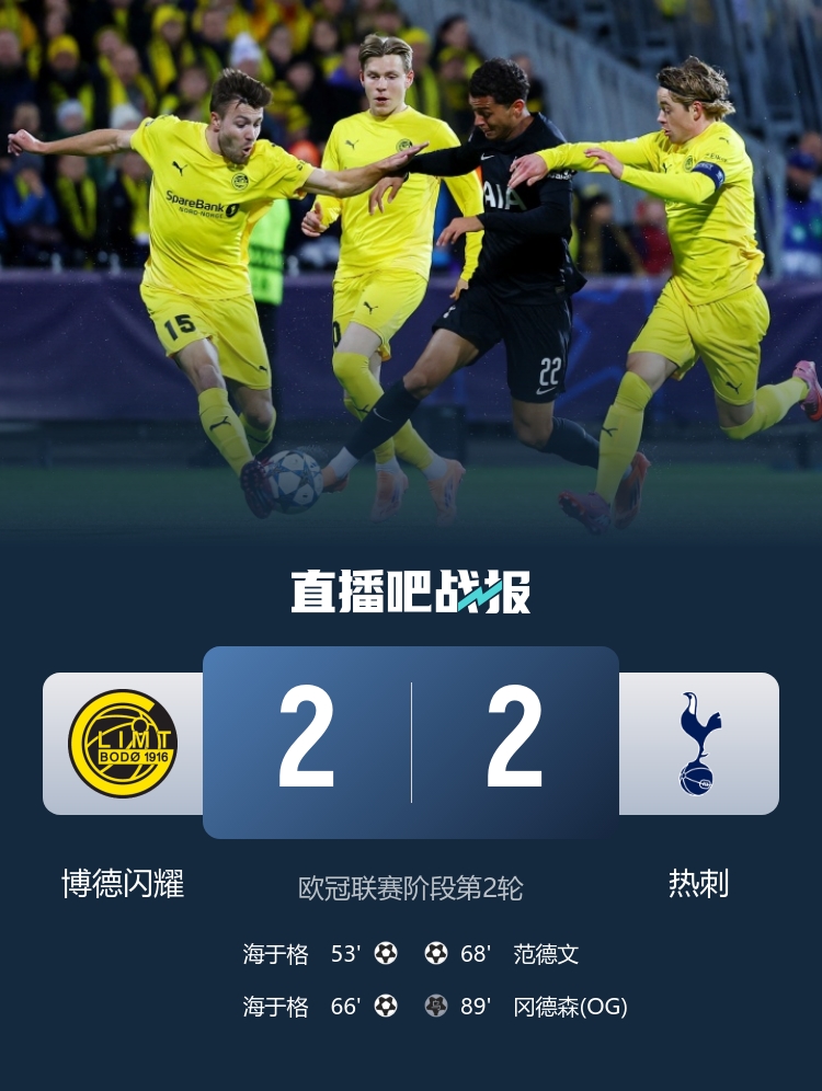 海于格个人秀双响,范德文破门,热刺造乌龙绝平。最终博德闪耀2-2热刺。 拜仁5-1帕福斯取欧冠两连胜 凯恩双响奥利塞一射两传杰克逊传射