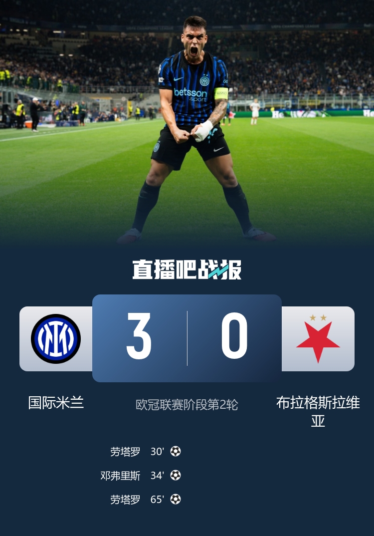劳塔罗梅开二度,邓弗里斯建功,布拉格斯拉维亚门将离谱失误。 87分钟绝杀!亚特兰大2-1逆转布鲁日 帕萨利奇制胜+造点 穆萨助攻