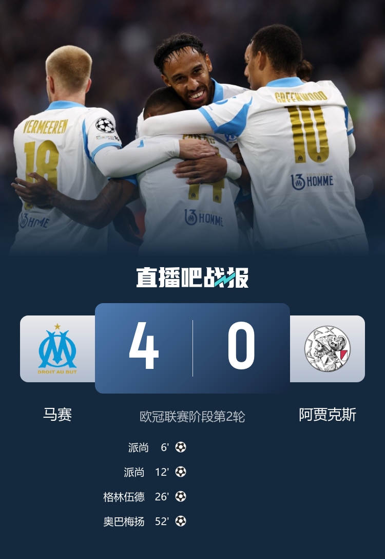 派尚2射1传,格林伍德破门,奥巴梅杨2传1射,最终马赛4-0阿贾克斯取得首胜。 【赛前声音】 为何阿诺德离队,你却拒绝皇马?萨利巴:他已赢过冠军,我还没有