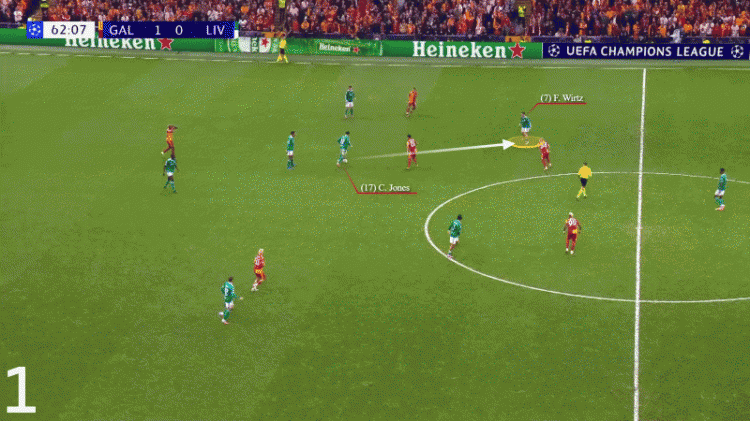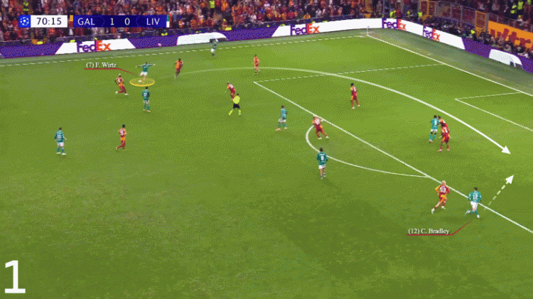 维尔茨自己倒是说过,他并不在意这笔转会费。可问题是,赛季初利物浦五场比赛全胜的时候(维尔茨也有首发),他开局慢热这事儿还没什么人提。等到最近两场一输,他就免不了被大家拿出来审视了。 周六客场打水晶宫,他被安排在前场三叉戟的左路,还拿到了自由内切的战术权限——这是斯洛特一次挺重要、也挺少见的战术调整,可惜最后没奏效,球队1比2输了。 三天后欧冠客战加拉塔萨雷,这位德国球员回到了自己最喜欢的十号位,可他还是利物浦阵中几个明显没踢开的球员之一。 当然,维尔茨到现在的表现也不是一直很差,甚至可以说,绝对不是。 多场比赛“存在感”不强的他,也有过高光时刻,特别是上个月在安菲尔德3比2赢下马竞的欧冠比赛,那时候他的实力还是能闪出来。 就拿对加拉塔萨雷这场来说,他传出了几脚好球,在球队0比1落后的下半场,还创造了利物浦为数不多机会中的两次: 第一次,他一脚直塞让伊萨克拿到了机会,可惜后者起脚太急了……