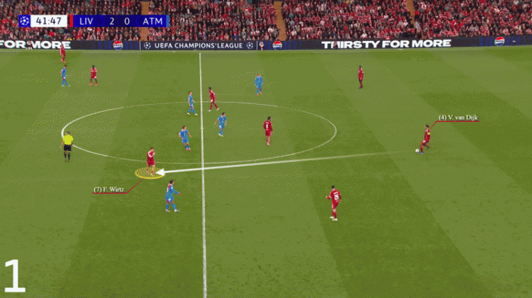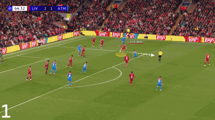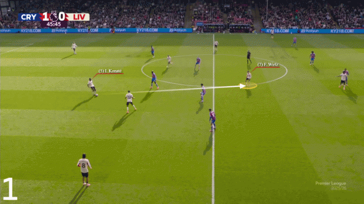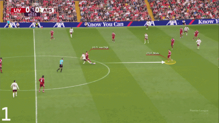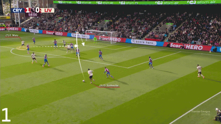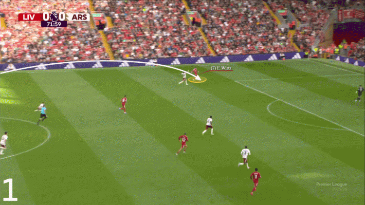 当然,维尔茨状态不佳,也不是利物浦没达到最佳水平的唯一原因。他们的进攻流畅度不够:萨拉赫和加克波都远不在最佳状态,而从纽卡斯尔转投而来的伊萨克因为错过了全部季前赛,现在还在恢复比赛体能。 在这位德国球员身后,赫拉芬贝赫踢得还行,可他的中场搭档麦卡利斯特就显得有点吃力。这位阿根廷国脚可以说是利物浦中场最重要的球员,因为节奏都由他掌控,可自从四月份以来,他还没为俱乐部踢满过90分钟,状态也一直不稳。 维尔茨是个喜欢跑动的球员。 他不停地移动、找空间。但在离开勒沃库森后的这个赛季初调整期,部分适应问题也在于:他的新队友们,同样需要时间去适应他的比赛风格。 比如下面这个例子,来自周六比赛下半场刚开始——这本是利物浦希望他能跑进去的位置……
