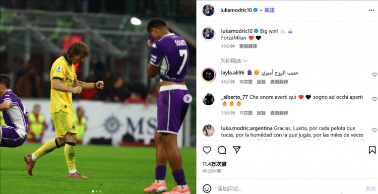 胜利+榜首!莫德里奇社媒庆祝:伟大的胜利!ForzaMilan❤️