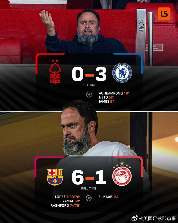希腊船王马里纳基斯经历了糟糕的一周 ❌10月18日 诺丁汉森林0比3切尔西 ❌10月22日 巴萨6比1奥林匹亚科斯 |