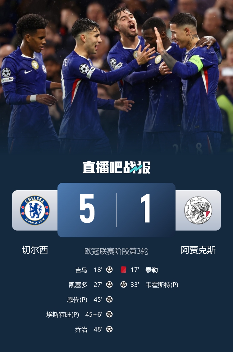 10月23日讯 欧冠联赛阶段第3轮,英超6队不败,仅热刺未能赢球。 英超球队本轮欧冠战绩: 阿森纳4-0马竞 曼城2-0比利亚雷亚尔 纽卡3-0本菲卡 切尔西5-1阿贾克斯 利物浦5-1法兰克福 热刺0-0摩纳哥