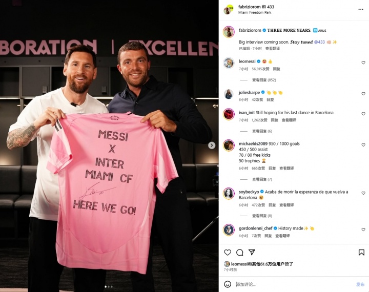 10月24日讯 北京时间10月23日晚,迈阿密国际官宣与梅西续约至2028年。 名记罗马诺和433将采访梅西,罗马诺晒出与梅西合影:重磅采访即将上线。 梅西点赞并评论: 之后罗马诺将这条动态置顶